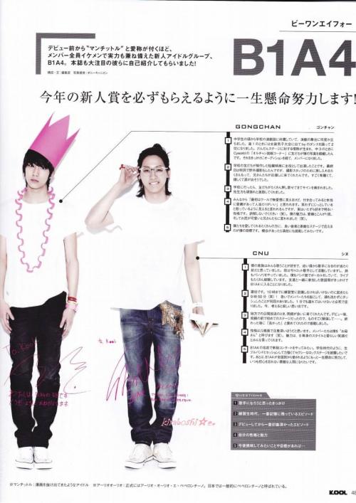 1: Aku selalu ingin ada di industri sejak aku masih muda. Aku suka menyanyi di depan orang, aku adalah wakil ketua kelas di dewan sekolah, aku mempunya kepribadian yang cocok di dewan sekolah. Sejak sekolah aku mengatur untuk mengasah kemampuan aktingku, aku juga mengambil bagian di film untuk sekolah. Sejak itu, fotoku di upload ke situs, dan aku ditemukan oleh perusahaan, jadi aku masuk ke B1A4.
